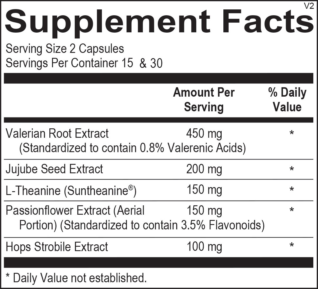 Botanicalm PM includes valerian root, a well-known herb used to help with sleep-related issues and to produce a state of relaxation. Passionflower and jujube have been traditionally used to induce relaxation in those experiencing overstimulation and scattered thoughts. L-theanine, an amino acid found in green tea, supports resilience to stress by increasing alpha brain wave activity. Two capsules of Botanicalm PM include 450 mg valerian root extract, 200 mg jujube seed extract, 150 mg passionflower extract, 150 mg L-theanine and 100 mg hops strobile extract.