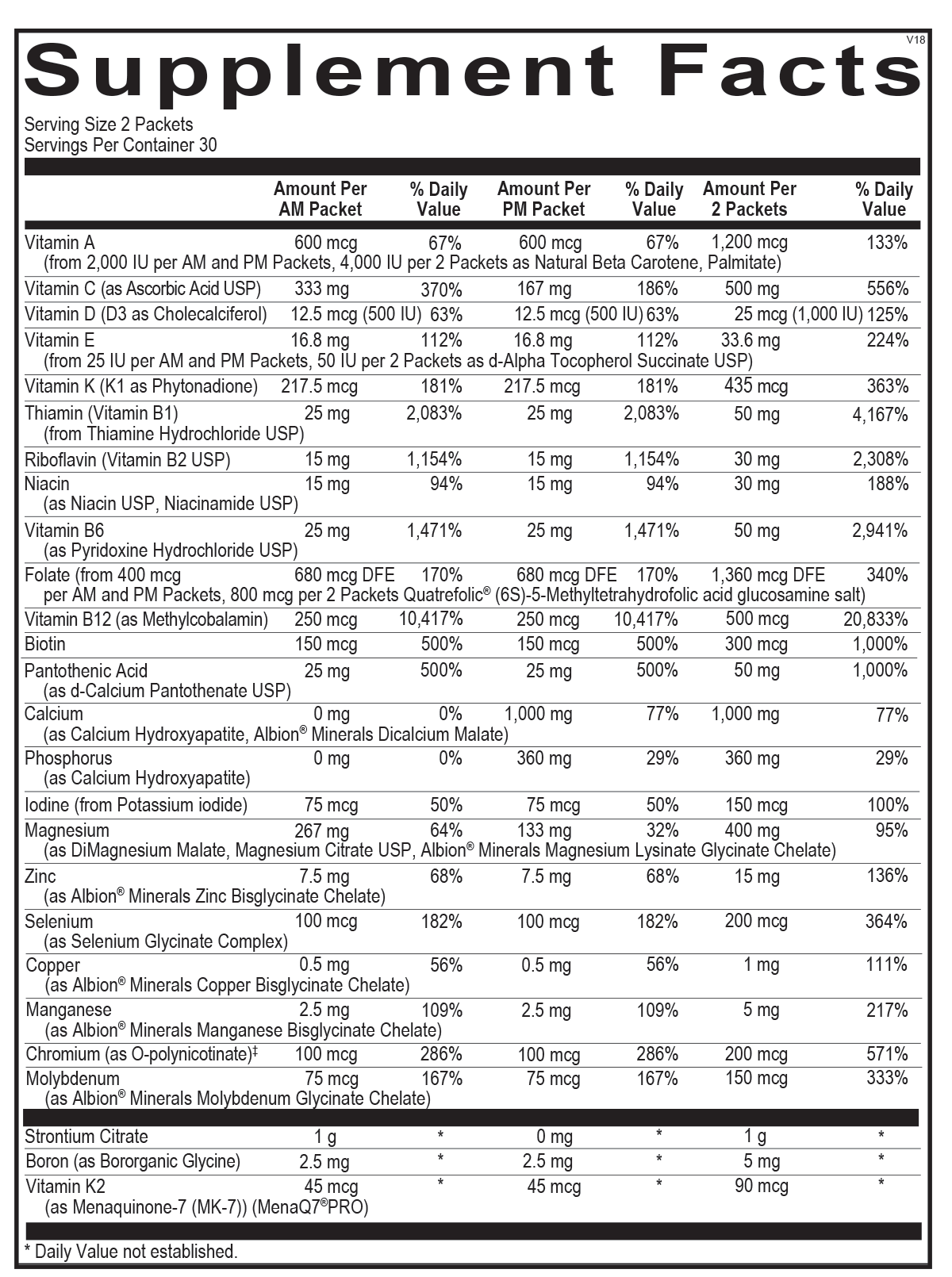 2 packets per day, one AM packet in the morning and one PM packet in the evening or as recommended by your health care professional.