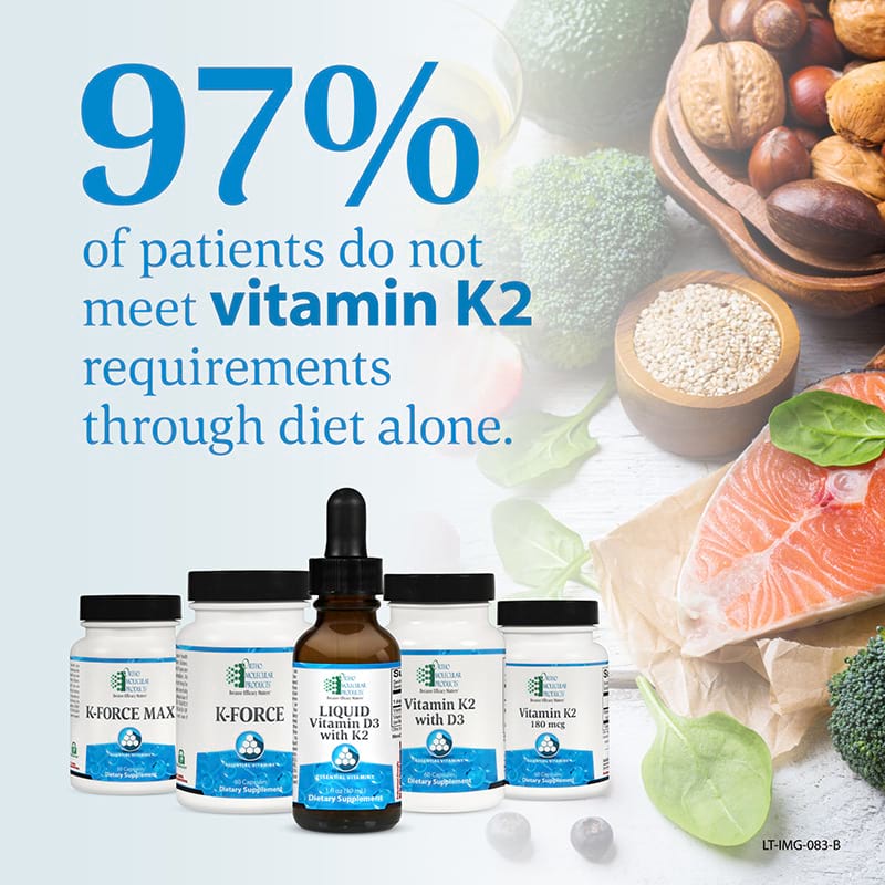 97% of Americans are deficient in vitamin K2, a powerful vitamin that is unfortunately almost absent from the American diet. Vitamin K2 acts like a calcium chaperone, making sure calcium is locked into the bones and kept out of the blood vessel wall. With an entire line of K2 products delivering the bioavailable form of vitamin K2, called MK-7, Ortho Molecular Products has an option for you. Ask our office today about these vitamin K2 products! #functionalmedicine #cardiovascular #bonehealth #MK7 #vitaminK2 #orthomolecularproducts #supplement #VitaminD3 #holistic #healthyVitaminD3andK2 #cardiometabolic